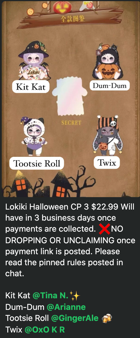 Lokiki Halloween CP 3 $22.99 Will have in 3 business days once payments are collected. ❌NO DROPPING OR UNCLAIMING once payment link is posted. Please read the pinned rules posted in chat.