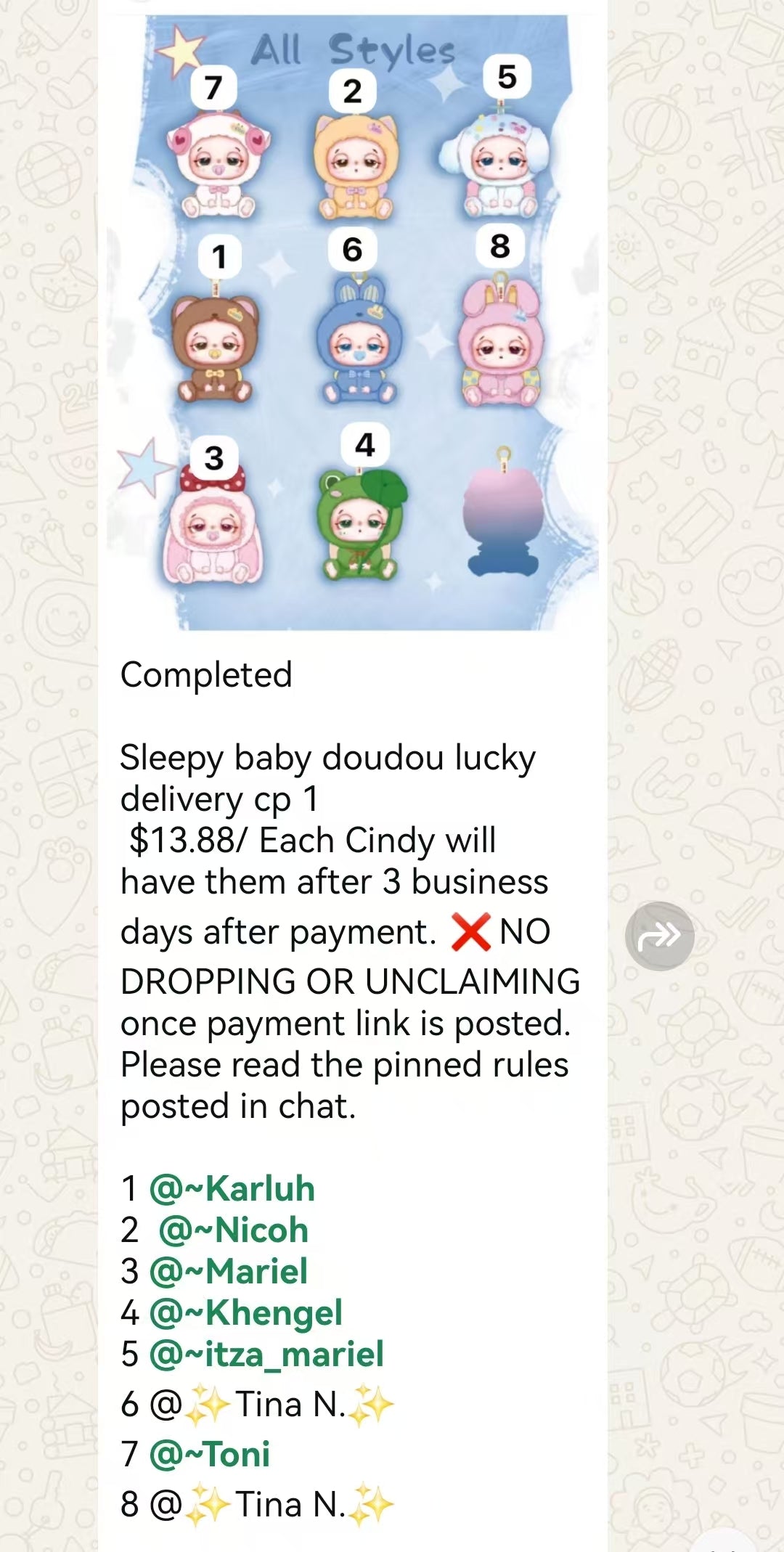 $13.88/ Each Cindy will have them after 3 business days after payment. ❌NO DROPPING OR UNCLAIMING once payment link is posted. Please read the pinned rules posted in chat.