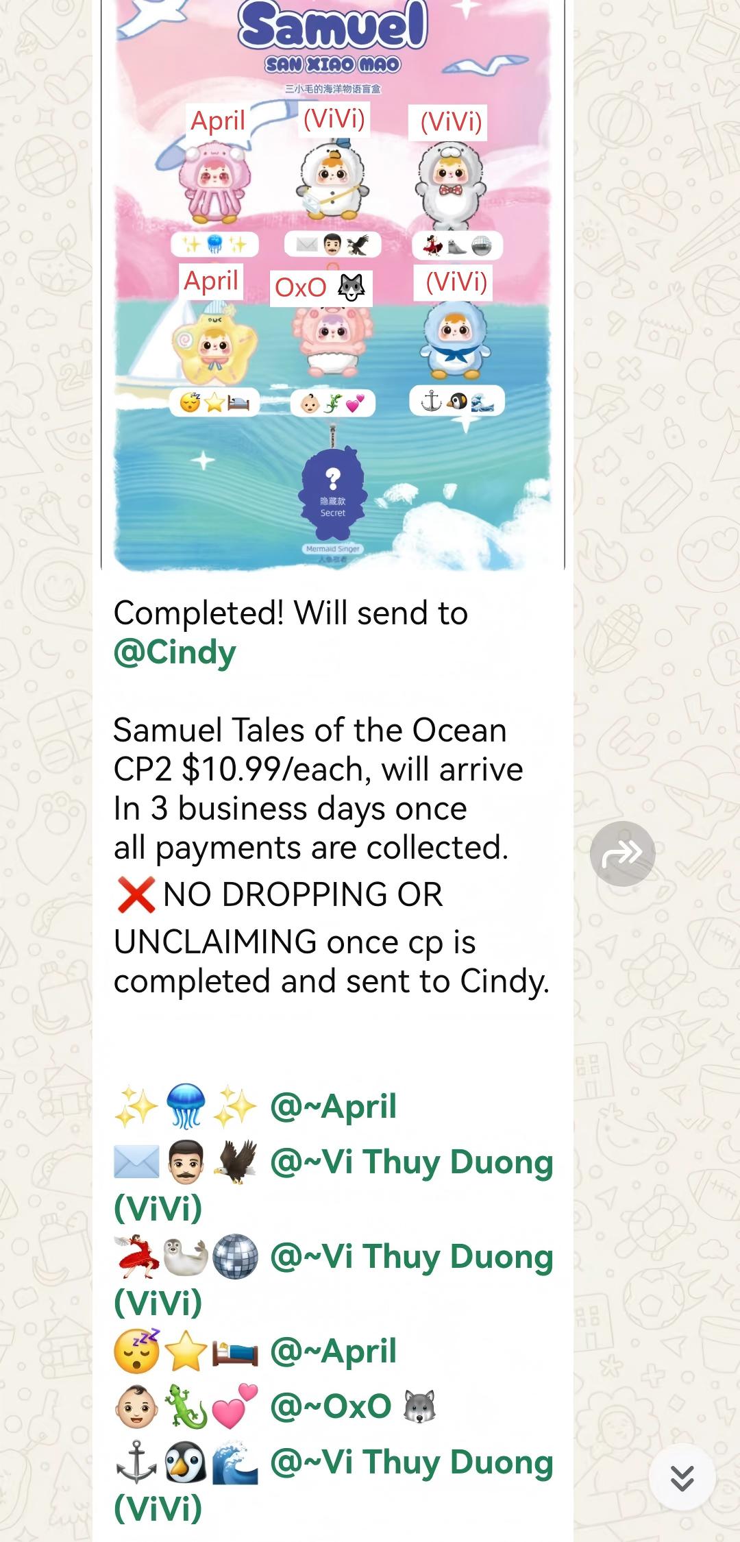 Samuel Tales of the Ocean CP2 $10.99/each, will arrive In 3 business days once all payments are collected. ❌NO DROPPING OR UNCLAIMING once cp is completed and sent to Cindy.